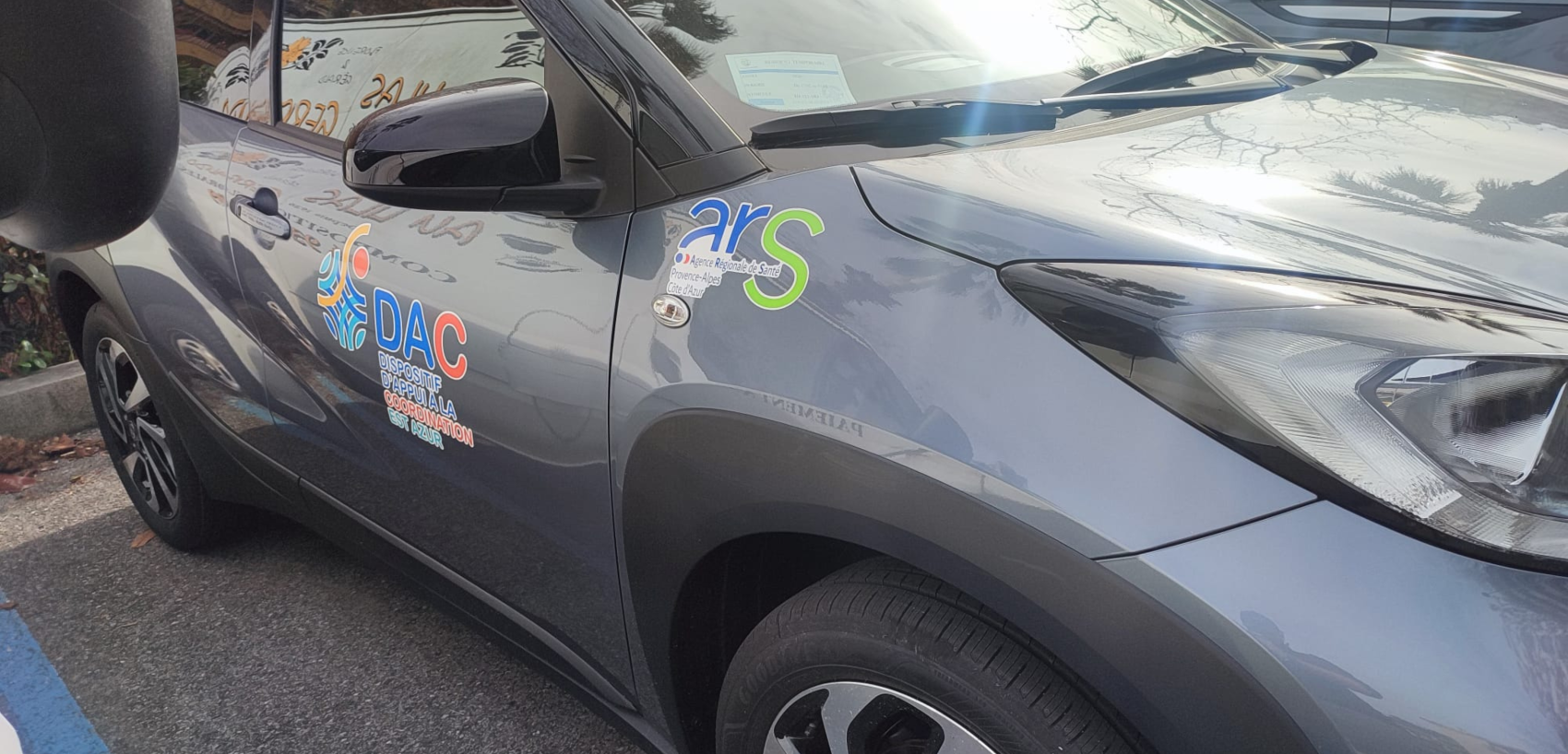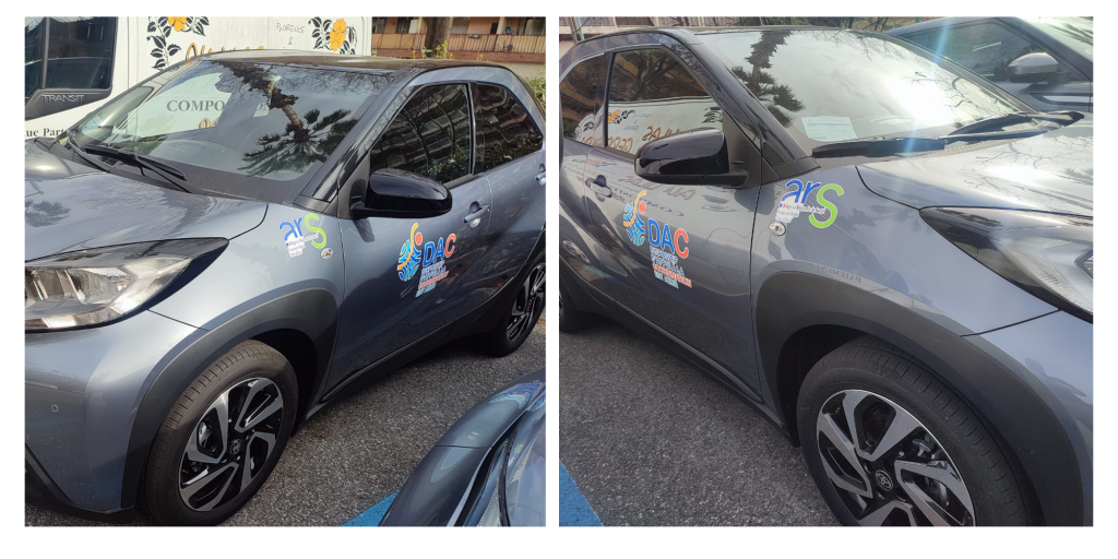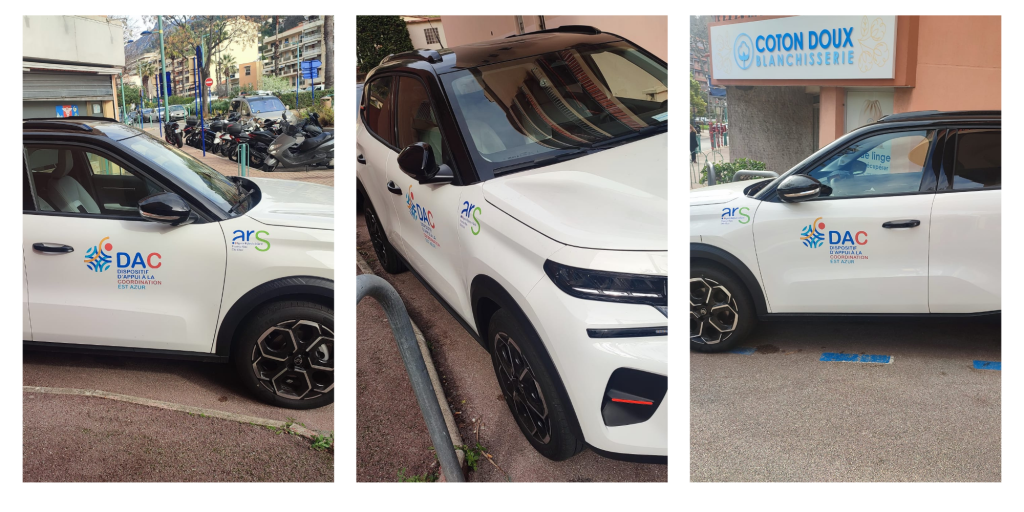 Pour DAC, Dispositif d’Appui à la Coordination EST Azur implanté à Menton, nous avons réalisé la fabrication et la pose d’adhésifs sur ses deux véhicules en impression numérique, avec pelliculage brillant et découpe.
